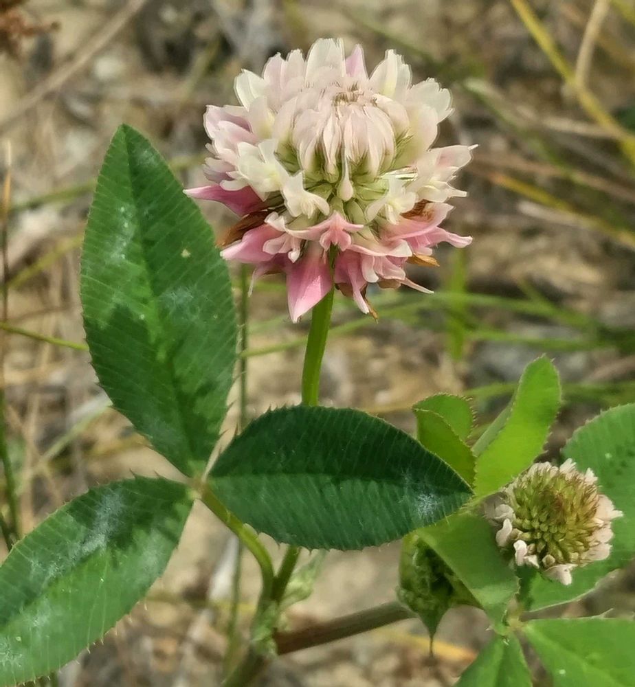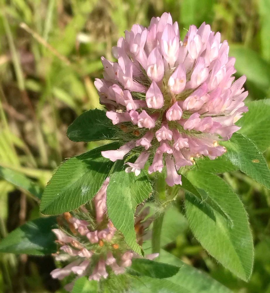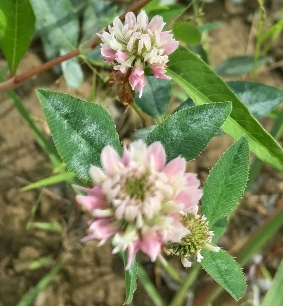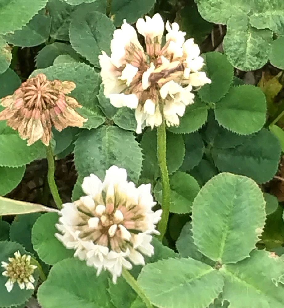 葉っぱはムラサキツメクサ、花はシロツメクサに似ています。
