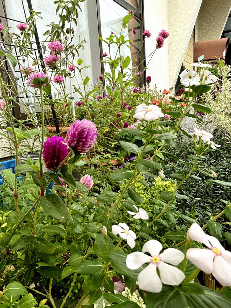 ①スッと伸びたセンニチコウ達🩷がウチ🏠の小さな庭に動きを与えてくれています。風に揺れる感じが可愛い〜🥰
