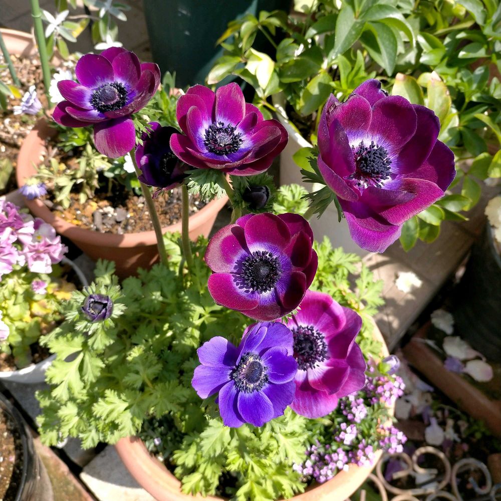 左下のアネモネ・ミストラルグレープは、おそらくうちで育てているミストラルワインと同じじゃないかしら。ミストラルは大輪花で、色もすごく素敵なワイン色です☺️