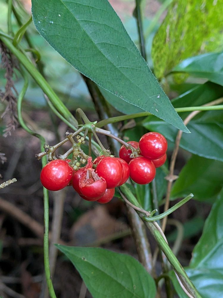 ハスノハカズラの花と実。この前はまだ緑色だった実が赤くなっていました。