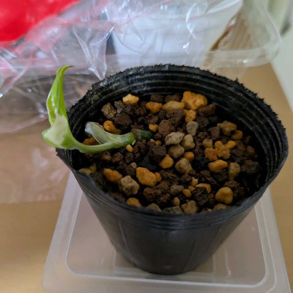 購入時、根腐れして葉一枚だけになってました。半年水挿しで過ごし、葉も枯れ、終わりか…と思った所で発根と新芽が🌱