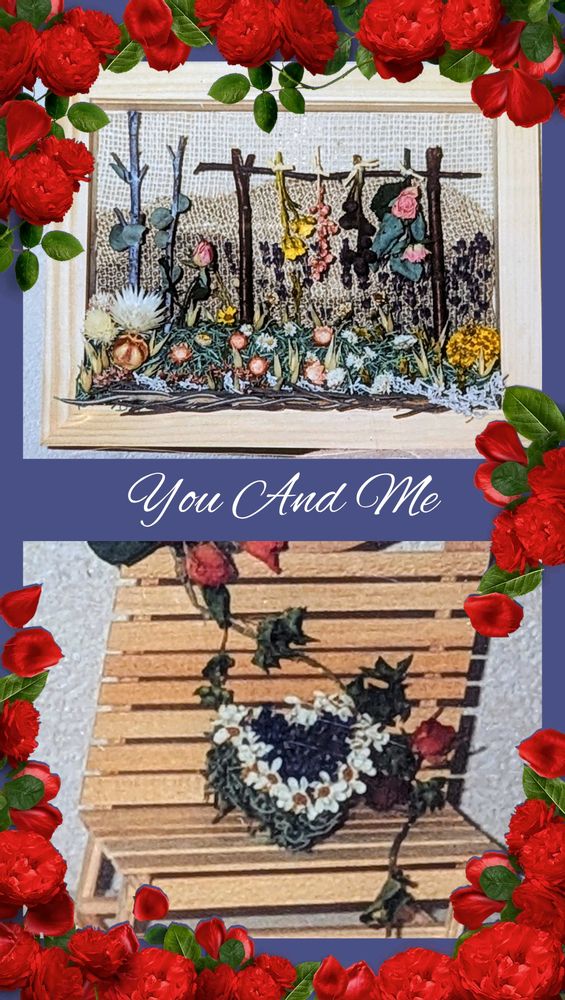 亡き主人が作ってくれた額、小さなベンチにドライフラワーで飾り付けした作品です🫶🩷💞