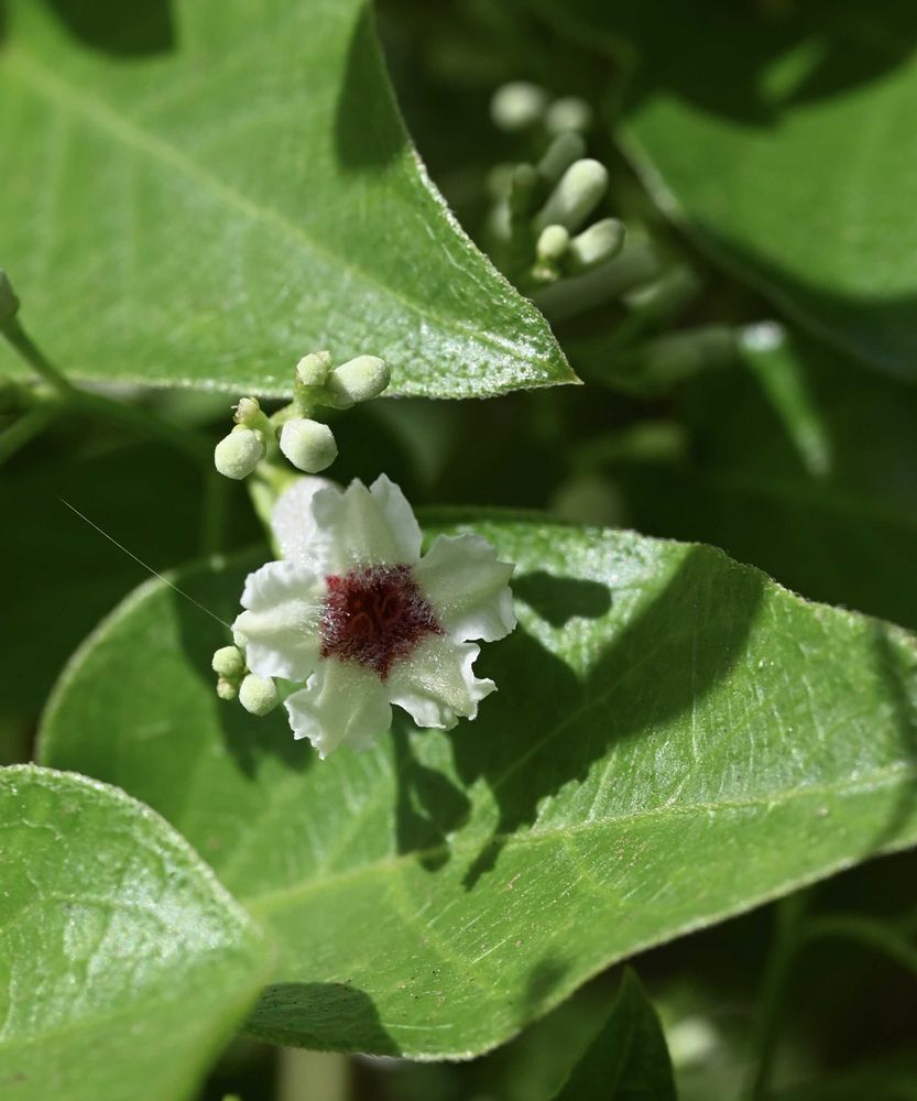 平開した「のど」の部分から筒状になった花冠内部にかけては紅紫色で腺毛が密生。