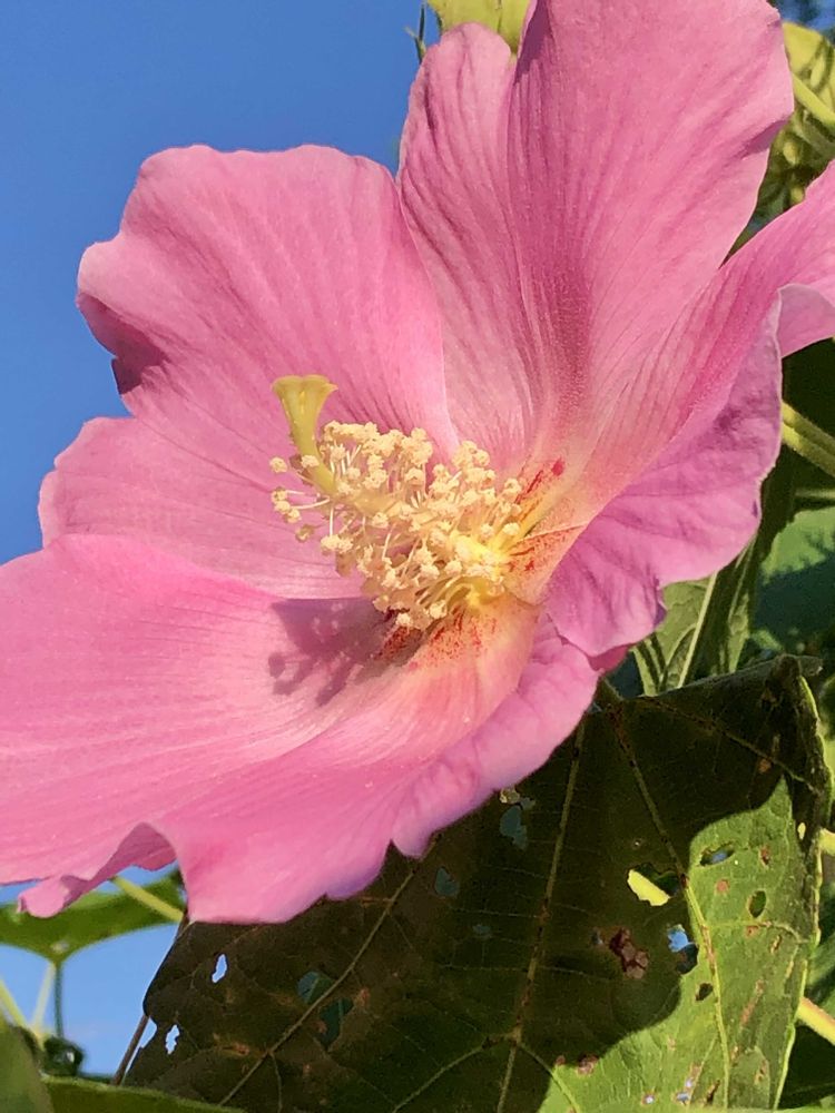 芙蓉(フヨウ)はアオイ科の花木です。 8月~10月の暑い時期に大輪の花を咲かせます。 花の大きさは10cmほどで、花びらのふわふわとした質感が魅力のひとつです。 花の色はピンク色や白色で、樹高は2m~3mほどになることがあります。