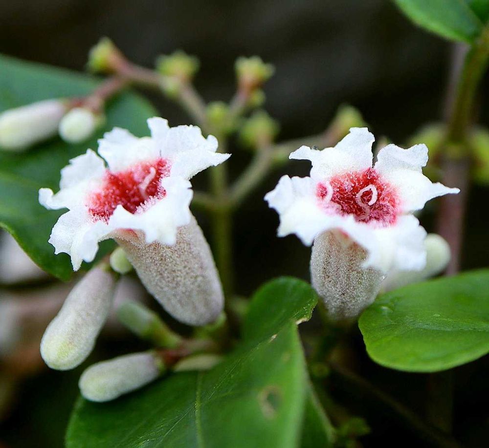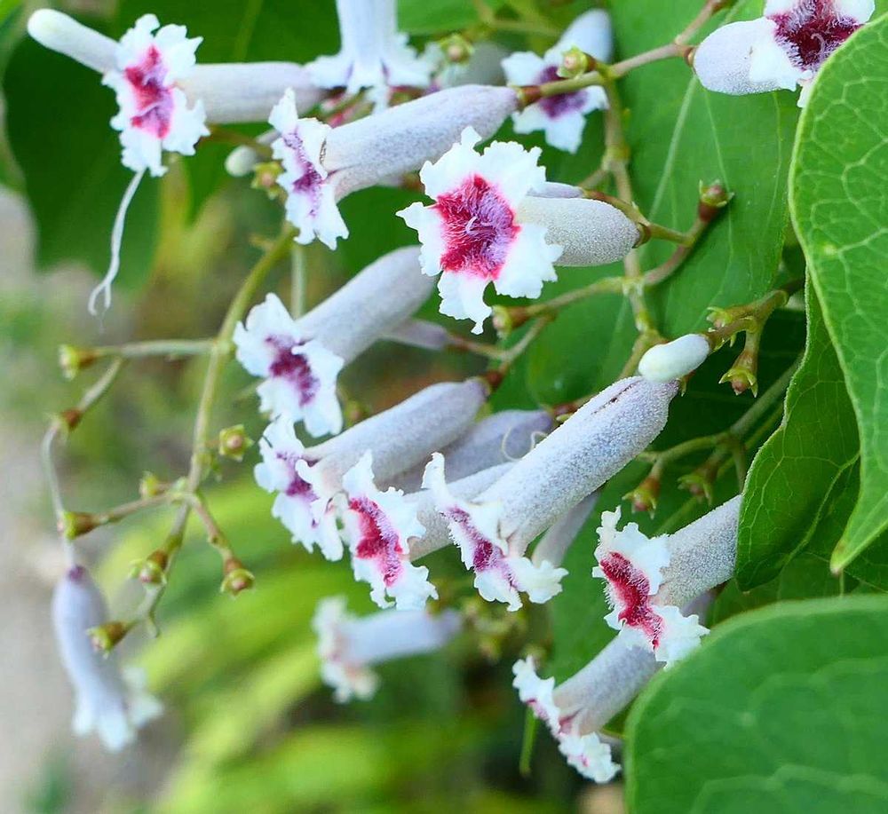 1~1.5cmほどの釣鐘型の小さな花は外側は光沢のある白、中心部は紫色をしている。
