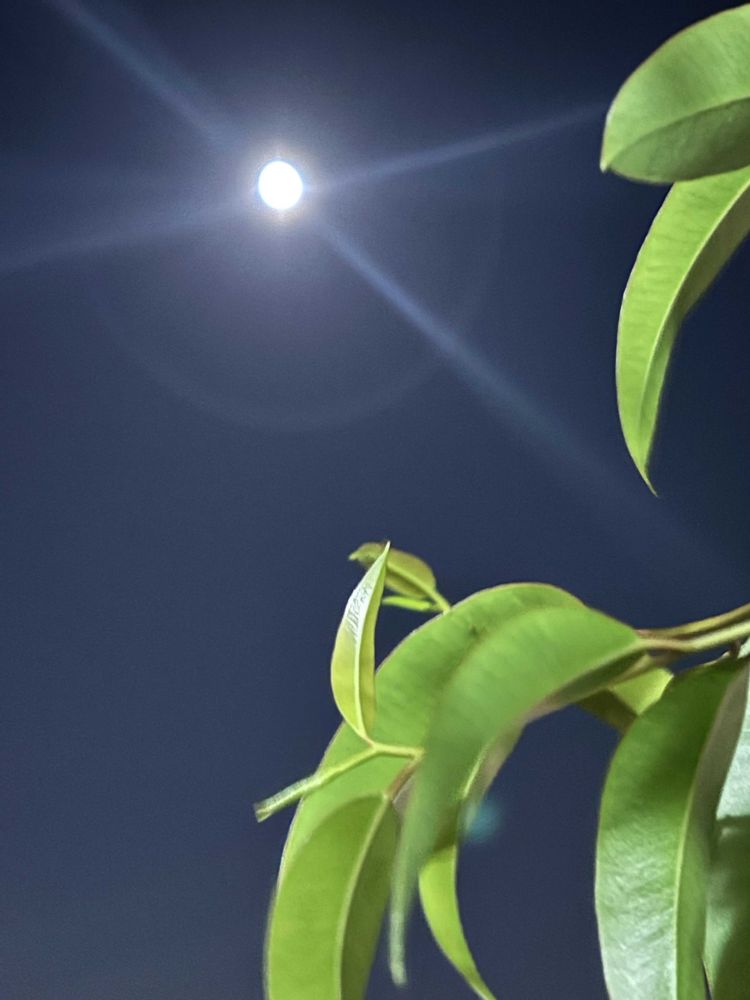 リビングでくつろいでいたら、明るいキレイな真ん丸お月様見えたので、ベランダに出てレモンユーカリとパチリ✨