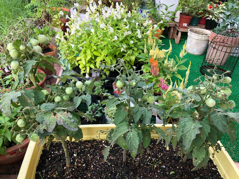 去年、種から育てて落ちた実をそのままにしていたら発芽🌱元気な苗を3本育てました🍅今から色づいてくれるのかなぁ🤔