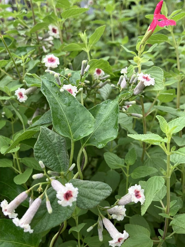 紫陽花やチェリーセージに絡みつく早乙女花(ヘクソカズラ) 花姿が可愛らしい🥰