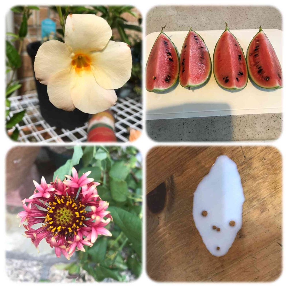 左上からサンパラソル、見切りコーナーからお連れして絡ませたかったけど台風やらなんやらで定位置決まらずのまま開花しました。