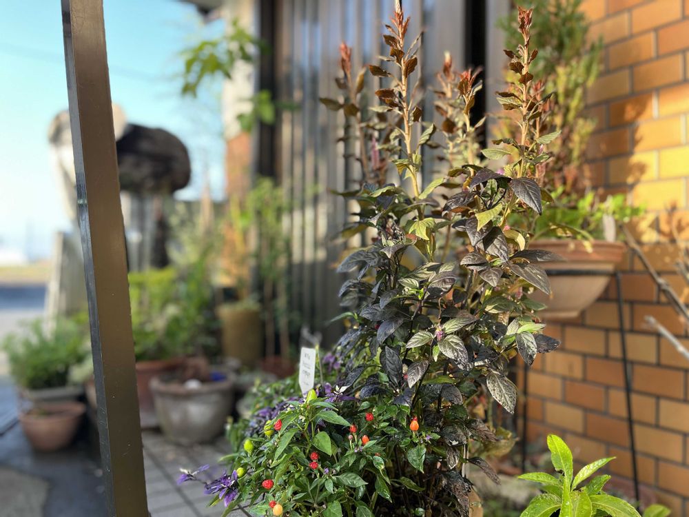 銅葉のお洒落なセロシアに、観賞用トウガラシ🌶️の葉色も綺麗🥰