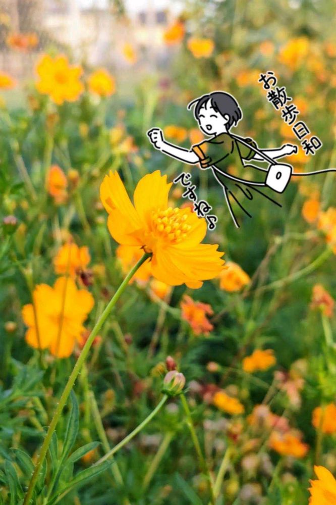 キバナコスモスの中をかけるお散歩ちゃん、スタンプならではですね〜💕