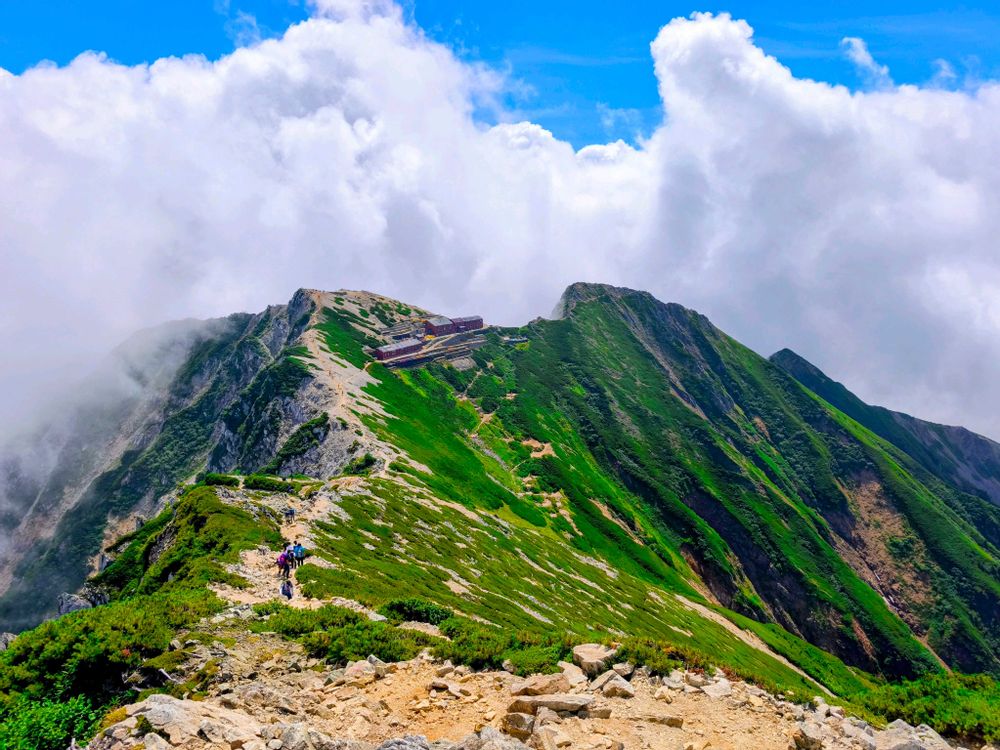 残念ながら剱岳などの山々は雲がかかり見えませんが、目の前には日本百名山の一つ「五竜岳」や唐松岳から続く崖が険しい「不帰の嶮(かえらずのけん)」などは雲の切れ間からチラチラとですが見えて絶景です🤩