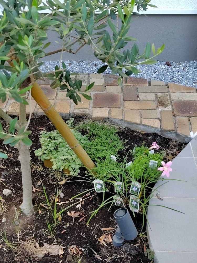 ④…最近引っ越されてきたお宅のシンボルツリー(オリーブの木)の下に並んでいるポット苗たち🤗🩷🌿