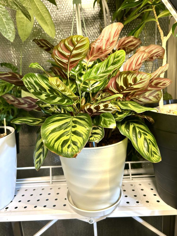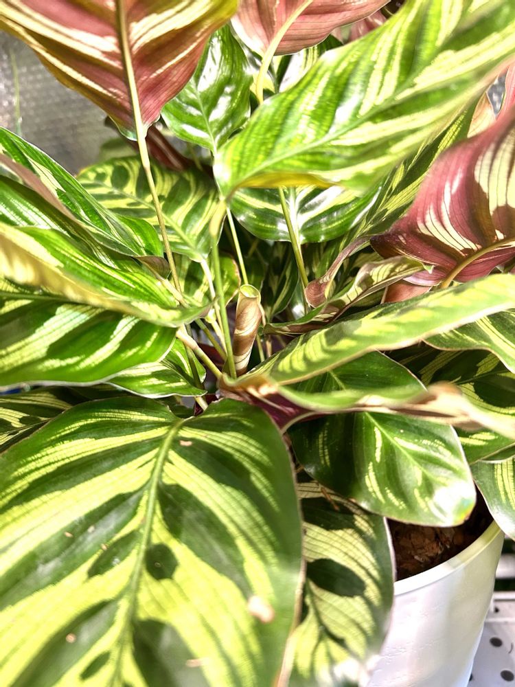 小さな暴れん坊将軍😊カラテアマコヤナ😊葉っぱが70枚を超えて、また新たな新芽のストローが6つほど出てきました😊どこまで鉢を大きくしたらいいのか悩みます😊現在6号鉢😊