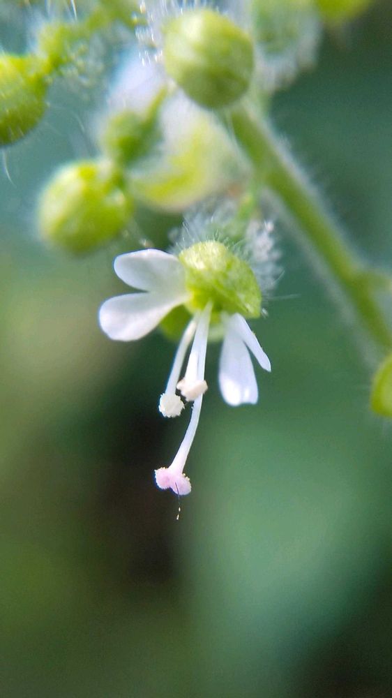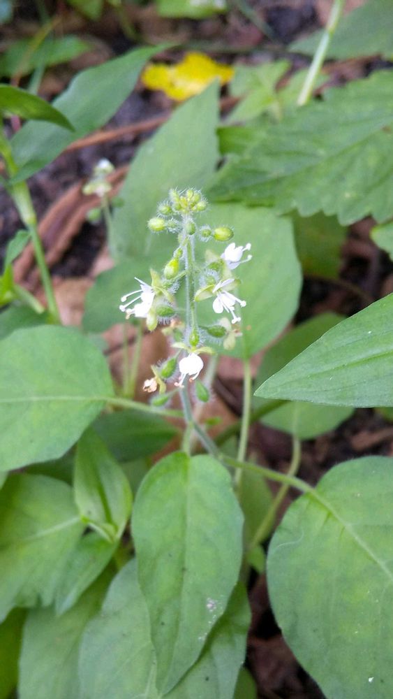 ミズタマソウでしょうか 林縁の湿り気のある日陰に とても小さな白い花を密やかに咲かせていました 名前のとおり 白い毛におおわれた小さくて丸い果実が水玉のようで目を引きました