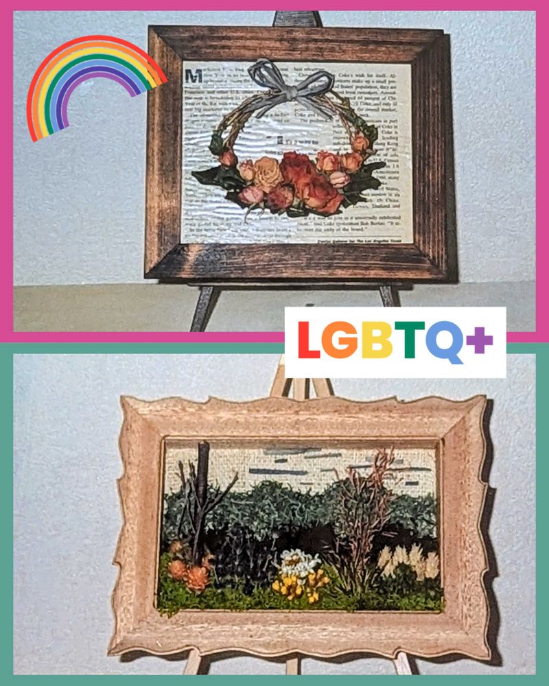 主人作の額とイーゼルに私がドライフラワーなどを飾り付けた作品になります😅