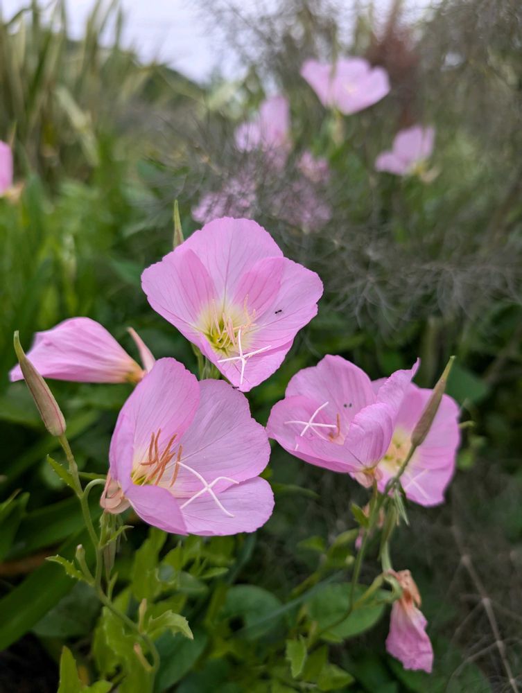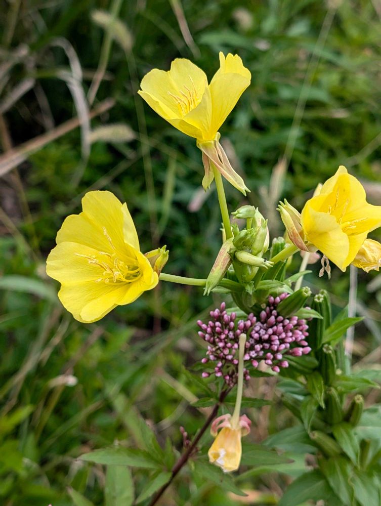 ①②マツヨイグサ(24/11公園)③昼咲き月見草(25/5公園)④朝顔団十郎(庭)⑤朝顔(庭)