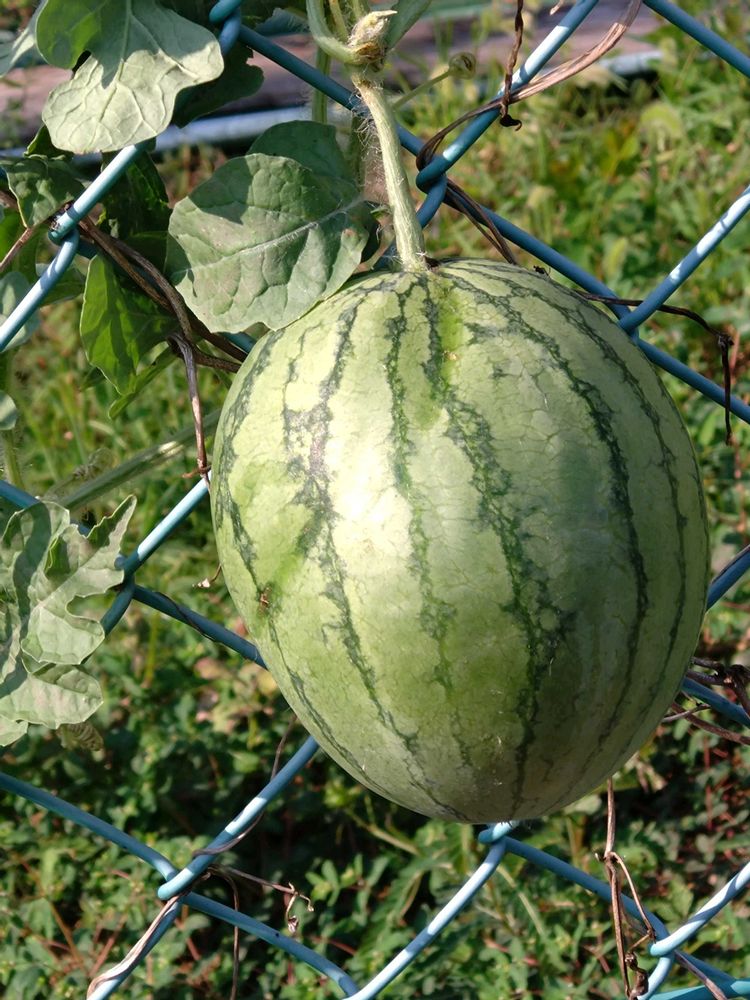 ❸ご近所の棟のフェンスから顔を出したスイカ🍉(10㌢)