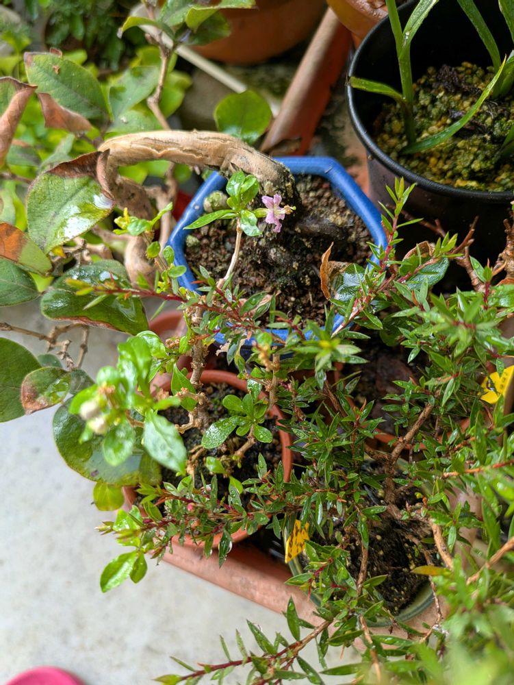 クコの葉が落ちて、ウグイスカグラの葉先が枯れたので軽く水切れしちゃったかな?と思っていたら、クコの花が咲きました(赤で囲った中)。