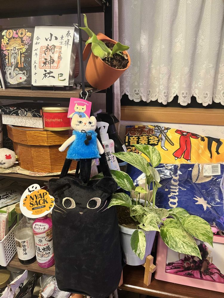 1.自宅🏠に「ニャップザック🐈⬛とハロウィンモコネコ🐈」をコウモリランと斑入りポトス🪴の側に飾って見ました😍💖