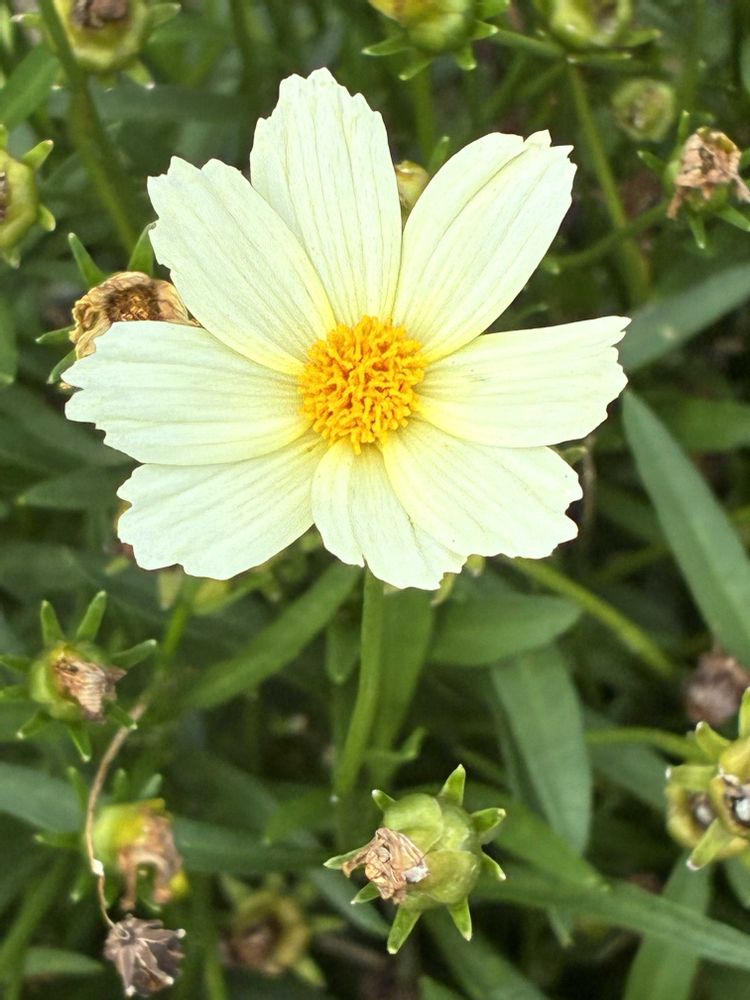 夕暮れ時、道路沿いの花壇にて、白い「コスモス」のお花をパチリ!📸🌼🌿😊