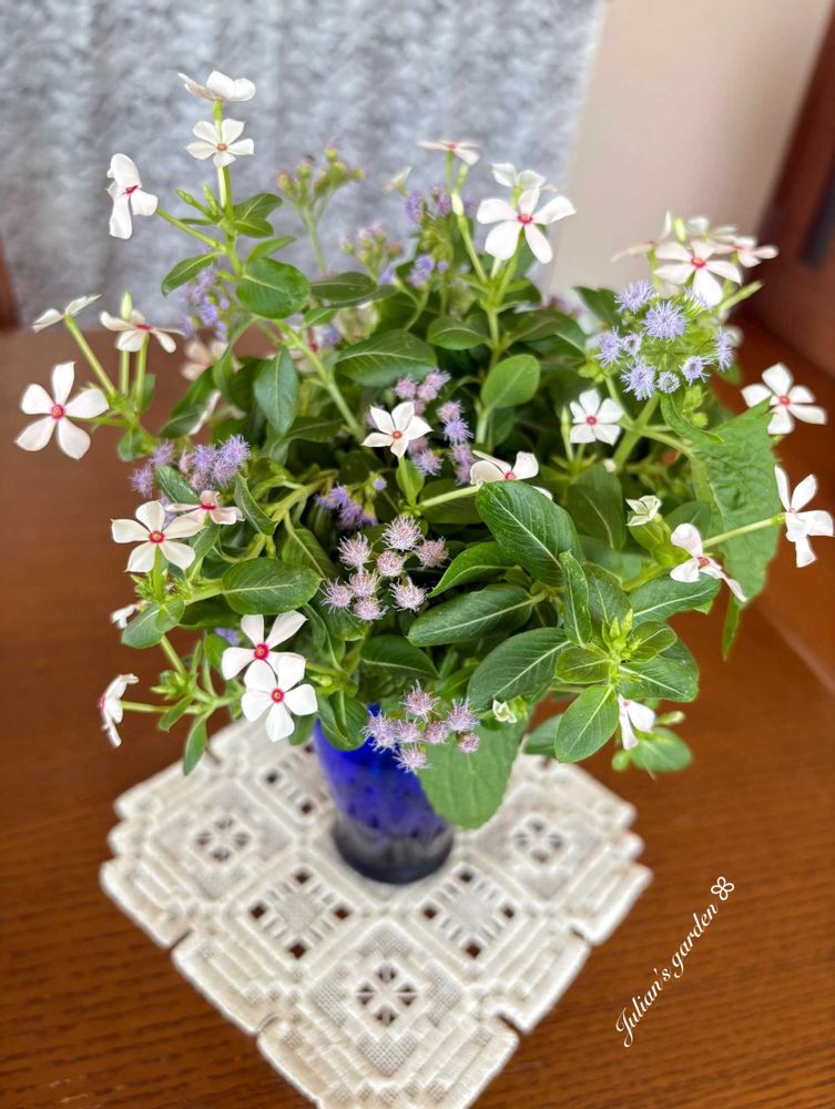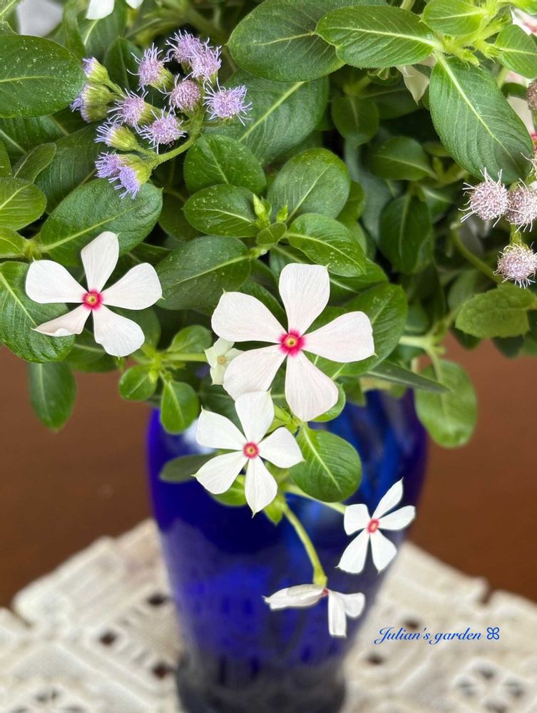 ③うちのニチニチソウの夏花火がもりもりになったので✂️して こぼれ種からのユーパトリウムと一緒に花瓶に生けました🤍💗🤍💚💜