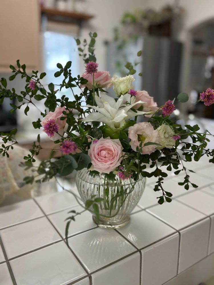 3️⃣頂いたクルクマとピンクのバラとトルコキキョウに庭のコプロスマとユーカリ、ゴンフレナを入れて