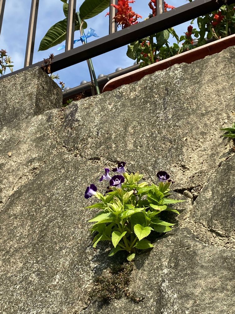 こぼれ種がそこに引っかかった。わずかな土と雨水で育った強い子👍