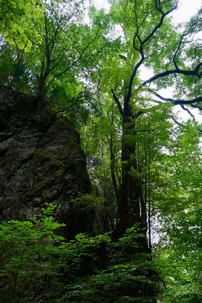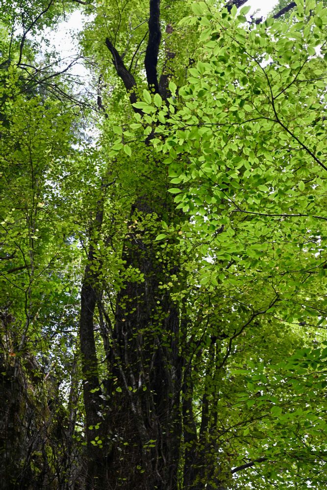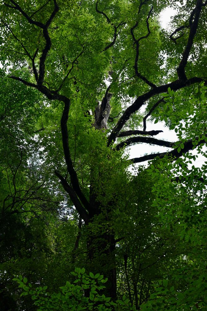 近くに滝があるために空気が湿り気を帯びていて、主幹は苔むしてふかふかとした緑が、かなり上の方まで広がっています。