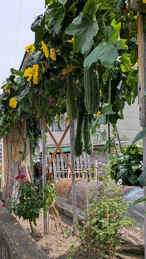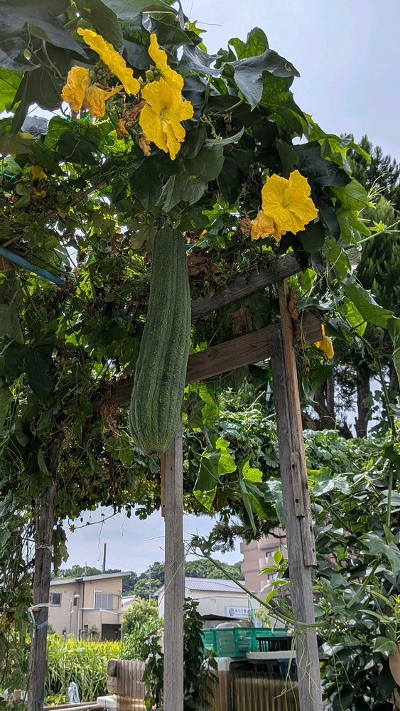 ヘチマの花と実です。ヘチマ棚にいっぱい 実がぶら下がっているのを見るのは初めてです。