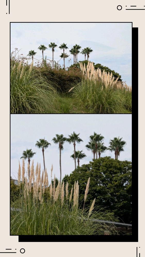 ヤシの木とパンパグラス、どこかの海辺の風景みたい。向こうがわは海?山?🤔