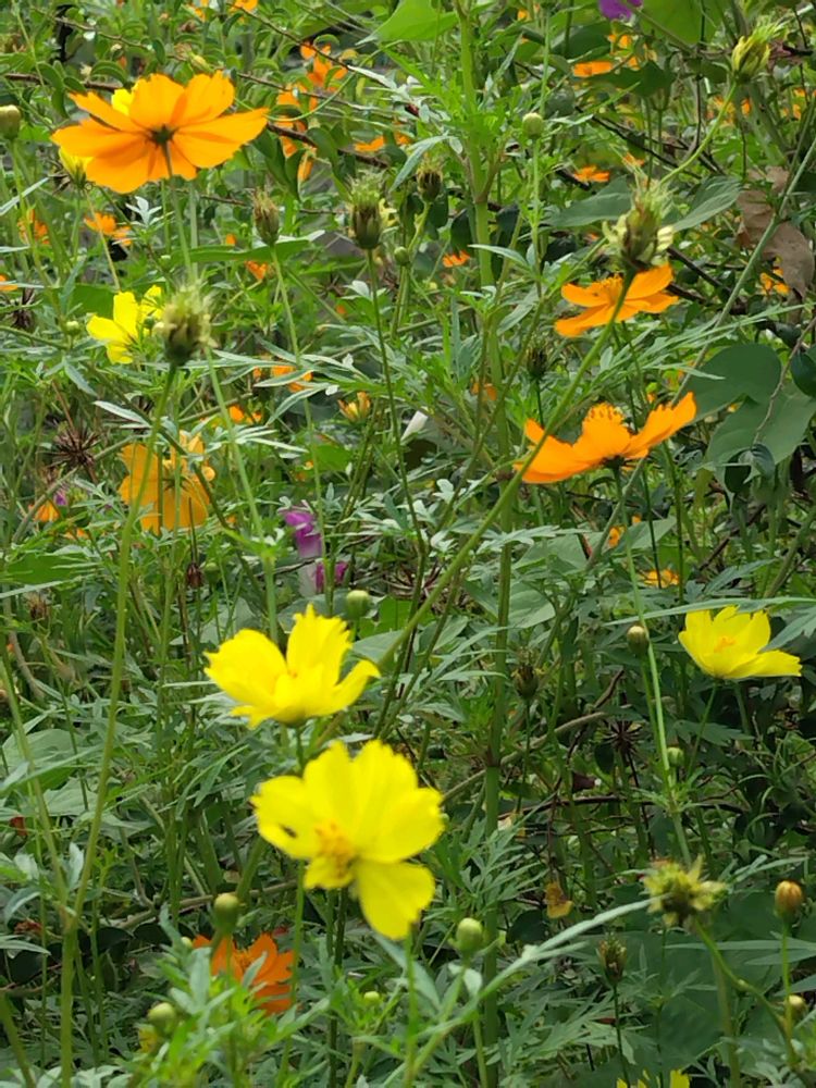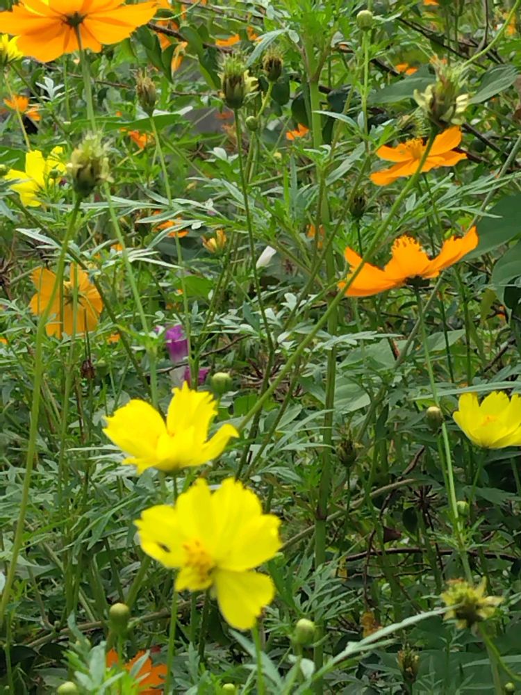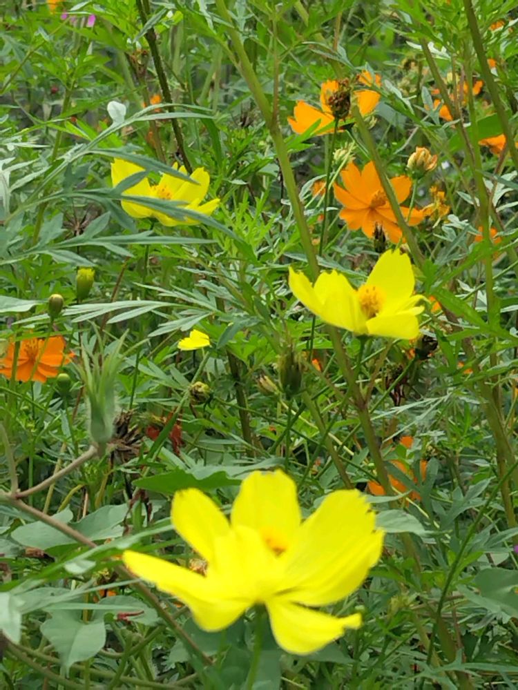 畑の一角にある花壇部分で暴れ咲いているこぼれ種のキバナコスモス🧡と、その隙間を縫うように何とか咲いているレモンイエローコスモス💛