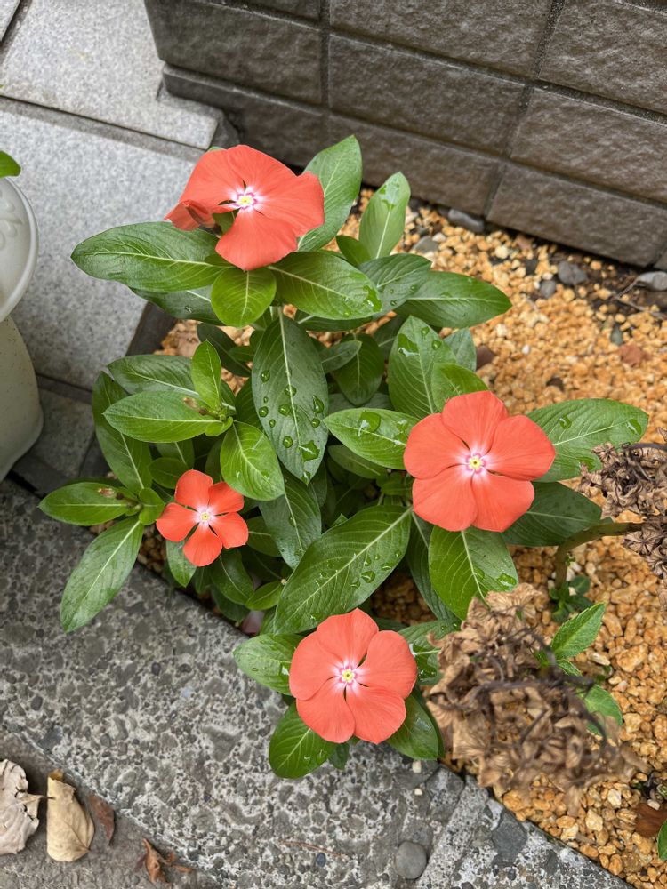 さんこんばんは🌃日々草の名前でした🤭🩷オレンジの色が好きでハイビスカスも追加で購入したかったんですが今あるのだけで我慢です😄