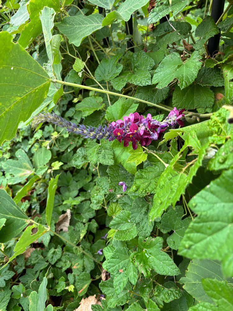 クズの花は木に巻きついてまるで藤の花のように垂れ下がって咲いてるとキレイだな〜と思いますが、うちの近くに生えているところは川のそばの土手にワサワサと生えていて、道路にまで進出してくる邪魔なツルって思ってました。