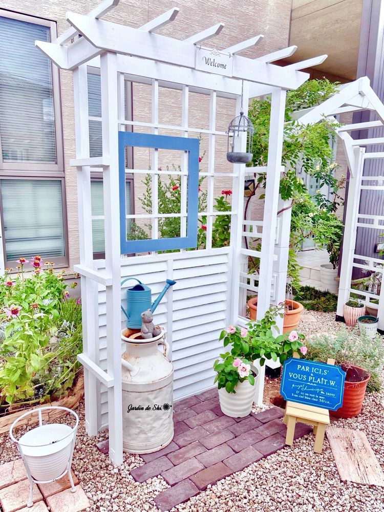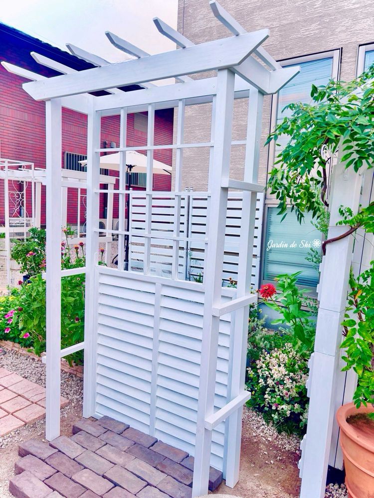 パーゴラ真っ白だと後ろに白のフェンスがあるからぼんやりしちゃうから急遽フレーム🪟作ってくっ付けてみたよ😊