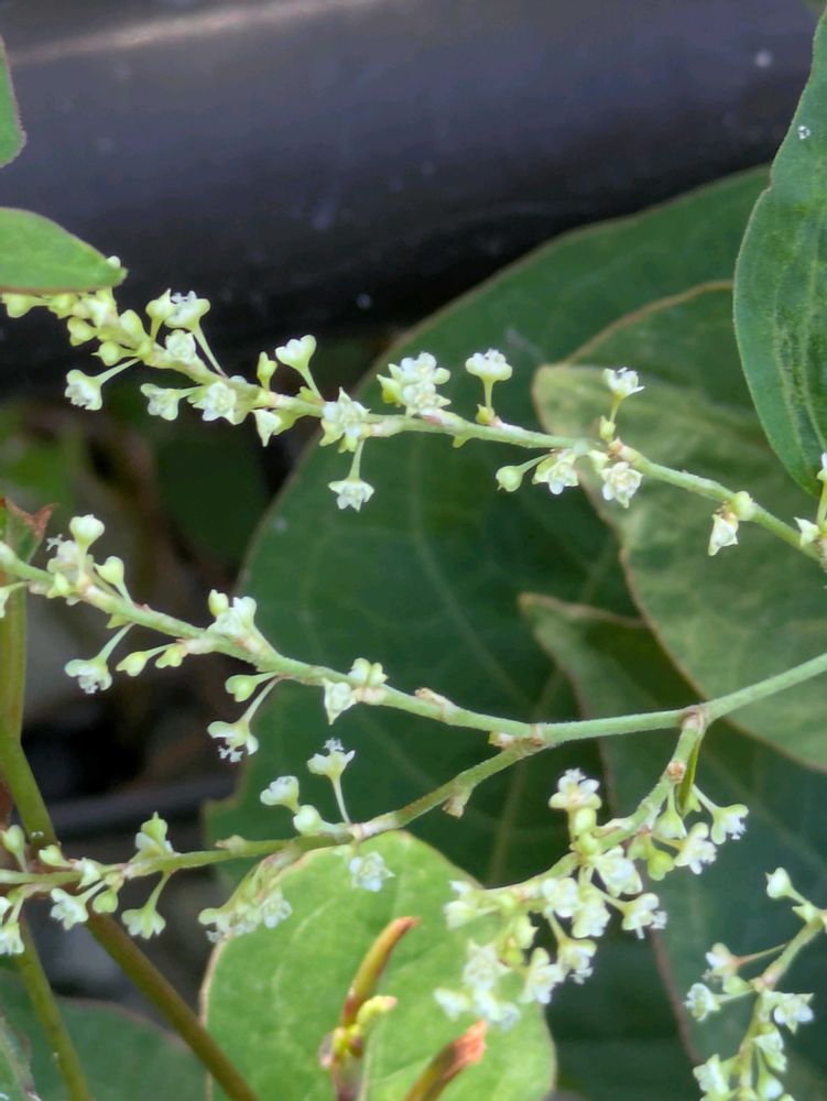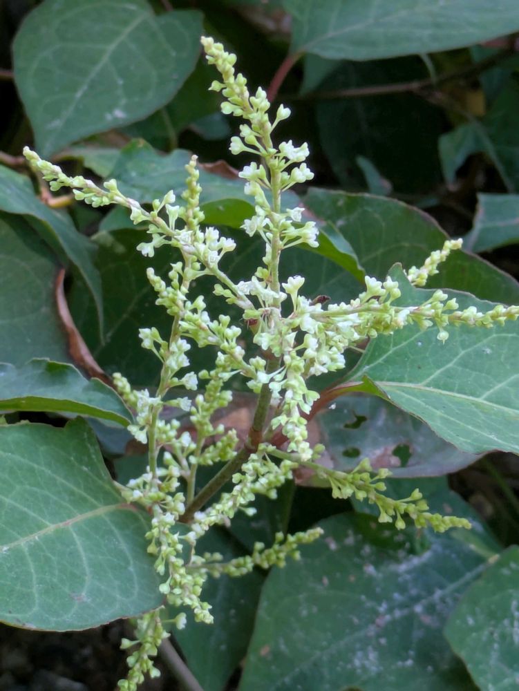 ②〜④イタドリ タデ科 ソバカズラ属 雌雄異株 ②と④とでは花穂の付き方が違います。雌花だろうか、雄花だろうかと拡大してみますが、ピントが良くなくこれとは判定出来ません。花穂がバラバラと付く②が雄花で縦1列に付く④が雌花かな?と見ていますが、違うでしょうか?③の花を見ると、柱頭が3つあるように見えますが、如何ですか?