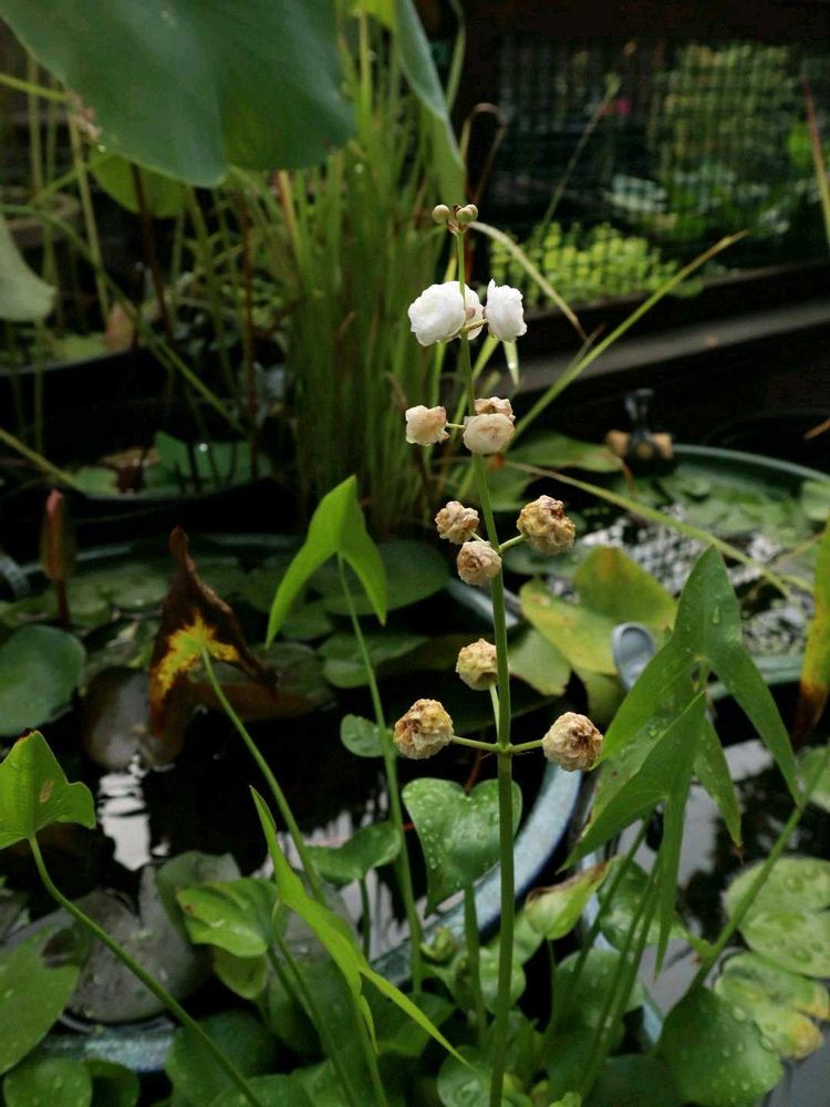 ①八重オモダカ②タコノアシ③ハスの果托④温帯スイレン「サイアムビューティー」⑤⚠️ツチガエル