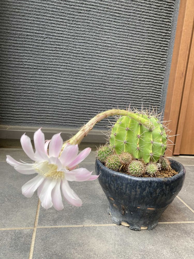 あいにくの雨ですが、サボテンが咲いてくれました。可憐なお花に喜ぶ一方で、今年3回目の開花で疲れてしまわないか心配…。