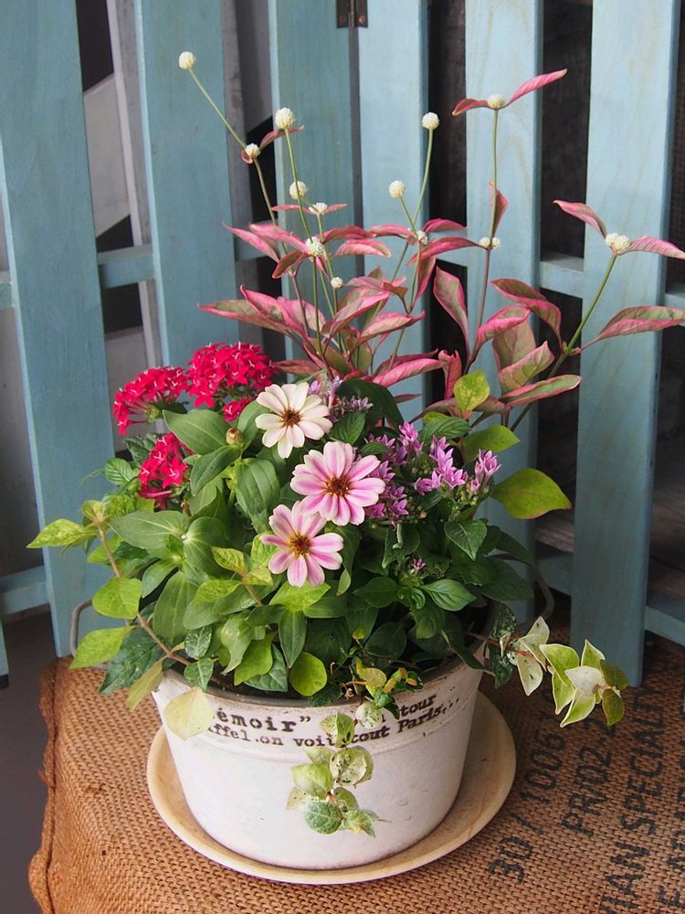 白い持ち手付きブリキコンテナに!ジニアとペンタスの寄せ植え