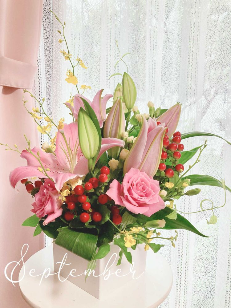 ピンク系にまとめられたバラとユリが華麗で真っ赤なヒペリカムが、アクセントになっていますねー✨❣️❣️❣️💐