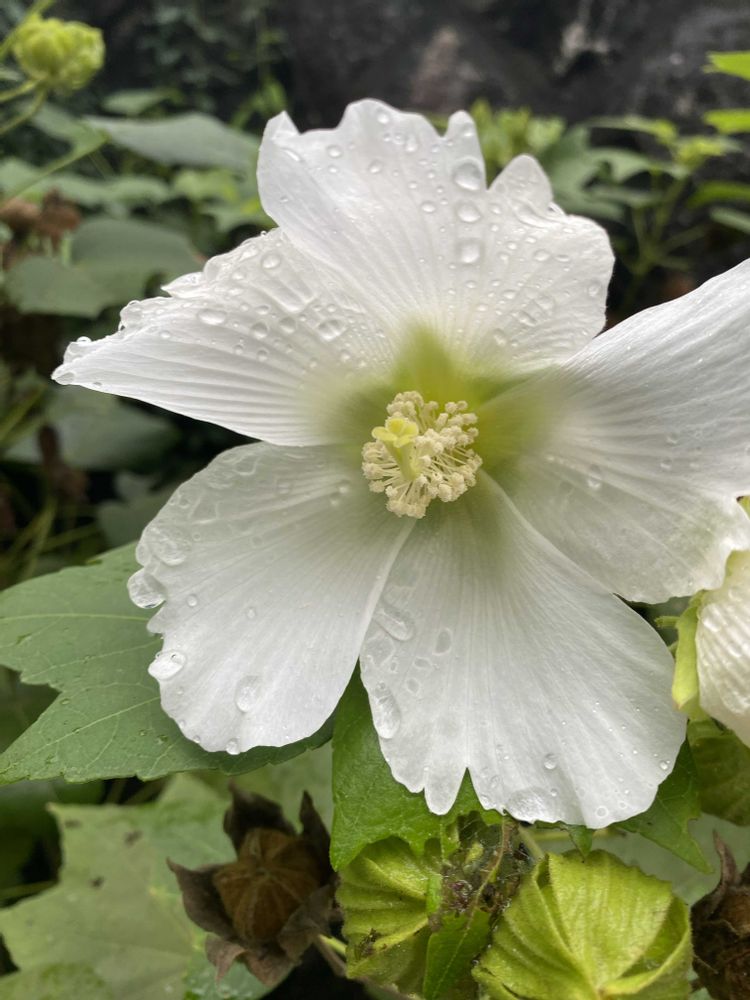 フヨウは色も形も好きですが、今朝の雨粒を纏った白い🤍フヨウは初めてあったような不思議な魅力がありました〜🤗🎶