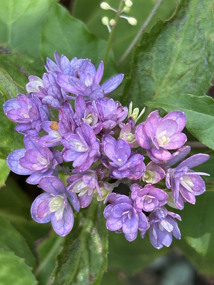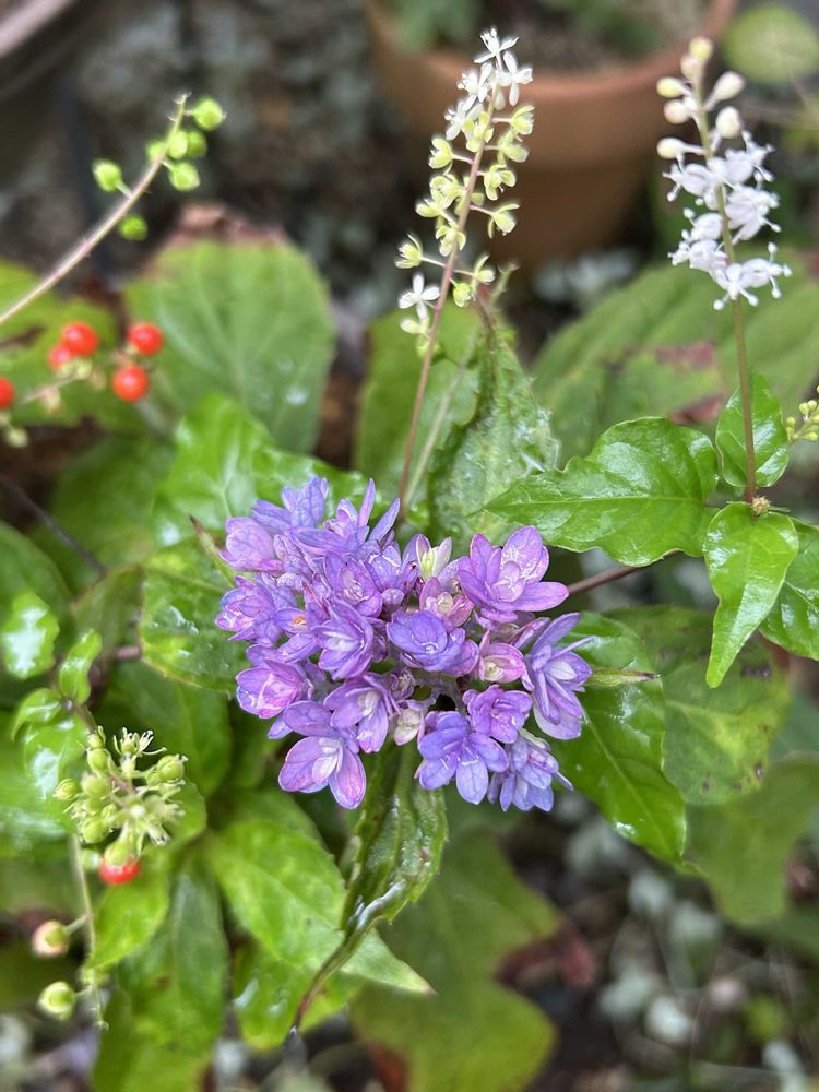 紫陽花マルルーの鉢植えに枝垂れて咲くジュズサンゴ