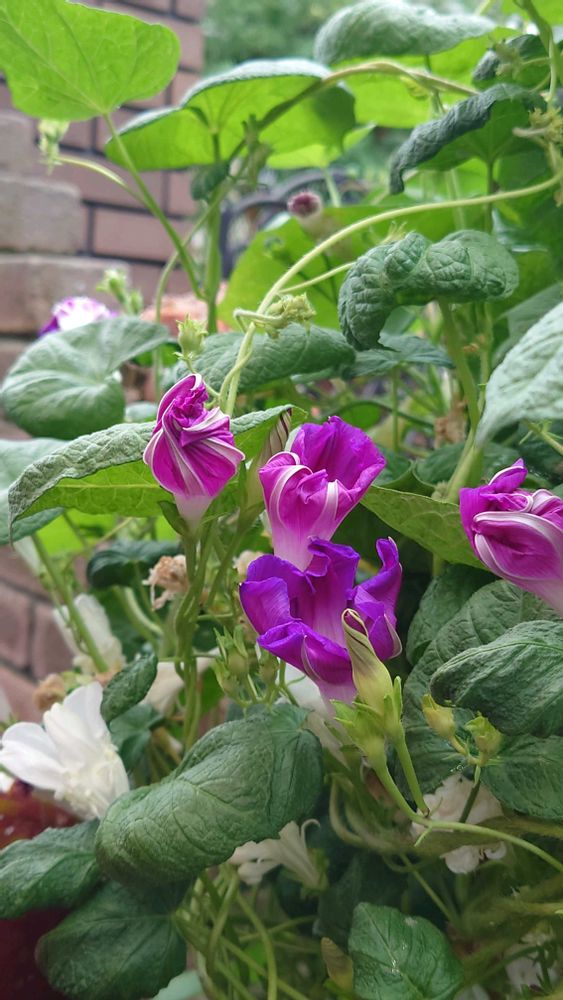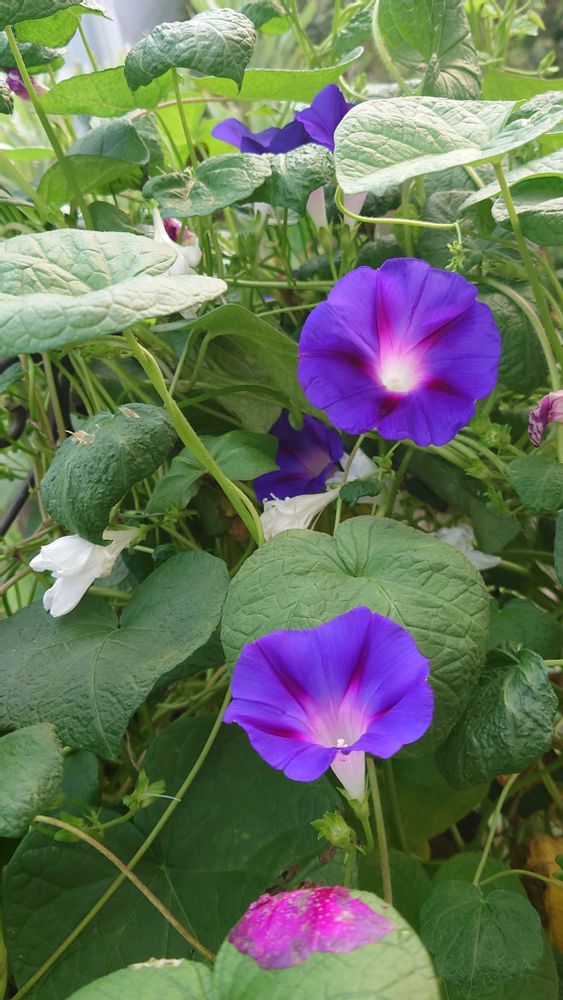アサガオ2種が絡まりながら沢山花を咲かせてます〜普通の紫のは夕方には萎んでるけど、スプリットペタルはそのまんま残ってます🤍💜✨
