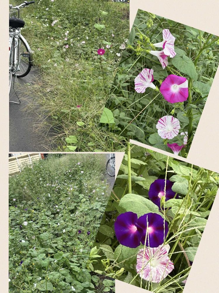 朝顔のこの場所は誰も管理して無く、背の高い草に絡んだり歩道にまでツルが伸びて咲いていました♪