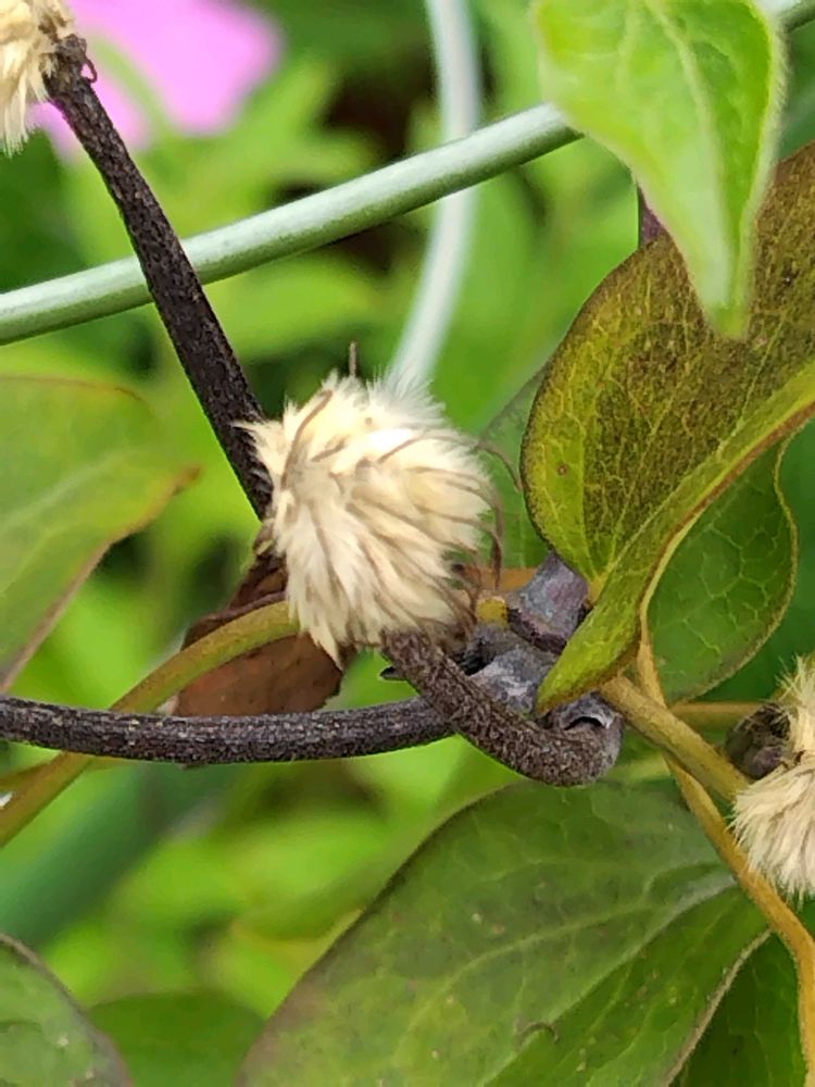 💜クレマチスの小さな蕾見つけた👀…種はずっと飛びもせずくっ付いたままで🤭