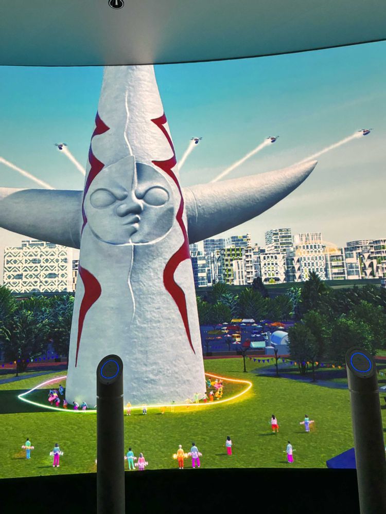 太陽の塔さんが、関西万博の大阪ヘルスケア館のリボーン体験リストを首にしています。♥️💙👀