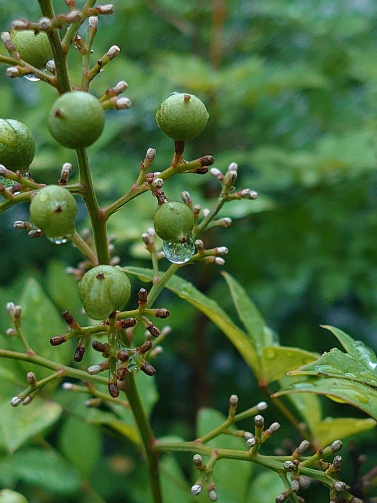 4️⃣ナンテンの緑の実も雫まとってみずみずしい🟢💧😊
