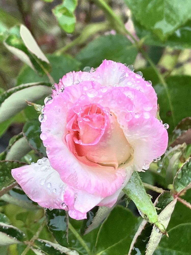 バラ 「ブリンセスドゥモナコ」も雨の中ポツポツ咲いています