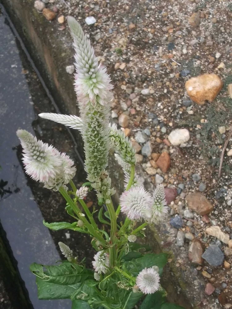街で見掛けた白色「ノゲイトウ」溢れ種からだろうか歩道きわに咲いています🙂