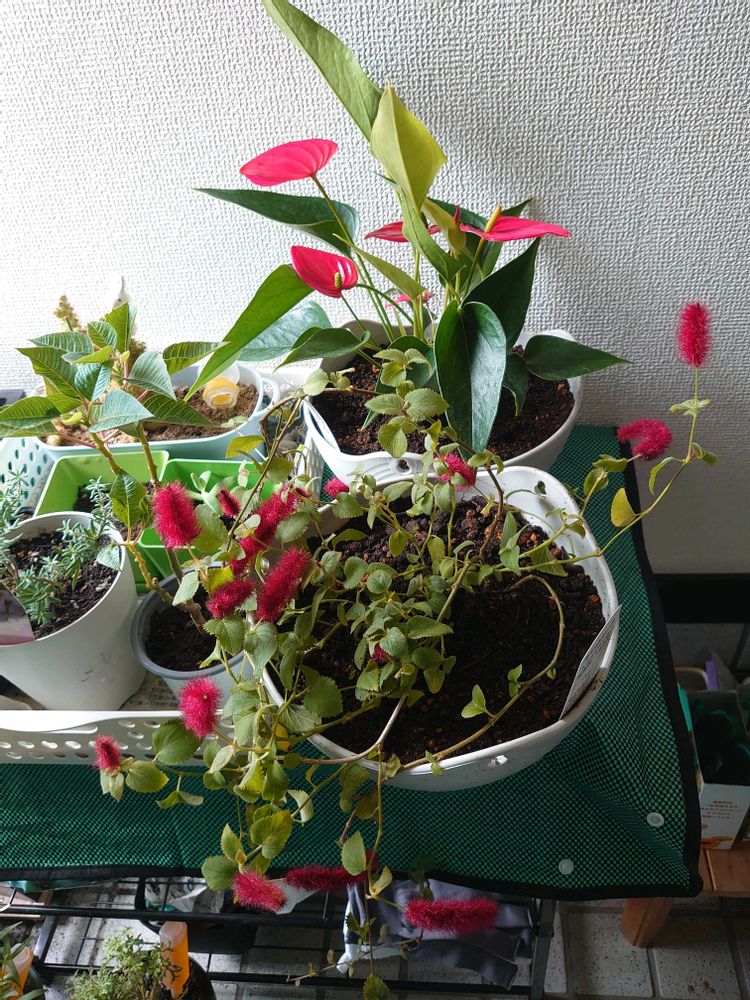 真っ赤で艶々の葉っぱのアンスリウムに真っ赤な尻尾のキャットテール。
